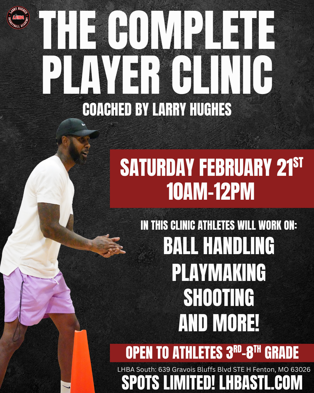 Join The Complete Player Clinic, a high-energy basketball training camp for boys & girls in grades 3rd–8th designed to build skills, confidence, and basketball IQ. Led by former NBA standout Larry Hughes, this youth basketball clinic focuses on complete player development in a positive, motivating environment.